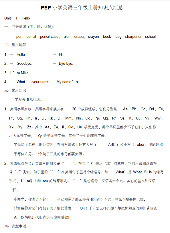 人教PEP - 英语三年级上册知识点汇总(PDF文档5页电子档下载)